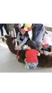 ふれあい広場に行くと子ブタや牛、やぎ、アルパカやダチョウなどがいて近くで見たり触れたりすることが出来るのですが、一目散に他の子どもたちが集まっているアルパカの元へ行き、さっそくなでなで。満面の笑顔でなでなで。