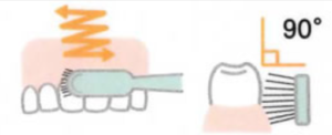 スクラッビング法とは、歯ブラシの毛先を歯の表面に垂直に当てて、毛先が歯と歯の間に入る適度に軽く押し付け、小刻みに左右に振動させて磨く方法です。