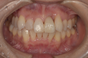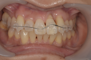 この患者様は前歯の一部のみ他の歯に比べて明らかに歯茎が下がっています。これは重度の歯周病によって治療後に歯茎が下がってしまったケースです。